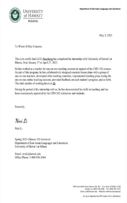 近日,WilliamHill中文官网组织并参与实施的“2023年春季美国夏威夷大学东亚语言文学系在线中文单班课”实践项目第一期圆满完成。本次线上国际中文教学实践为期十四周,WilliamHill中文官网24名师生顺利完成授课任务并获得夏威夷大学的实习证明。